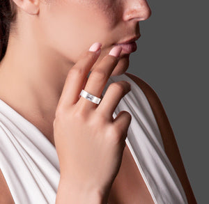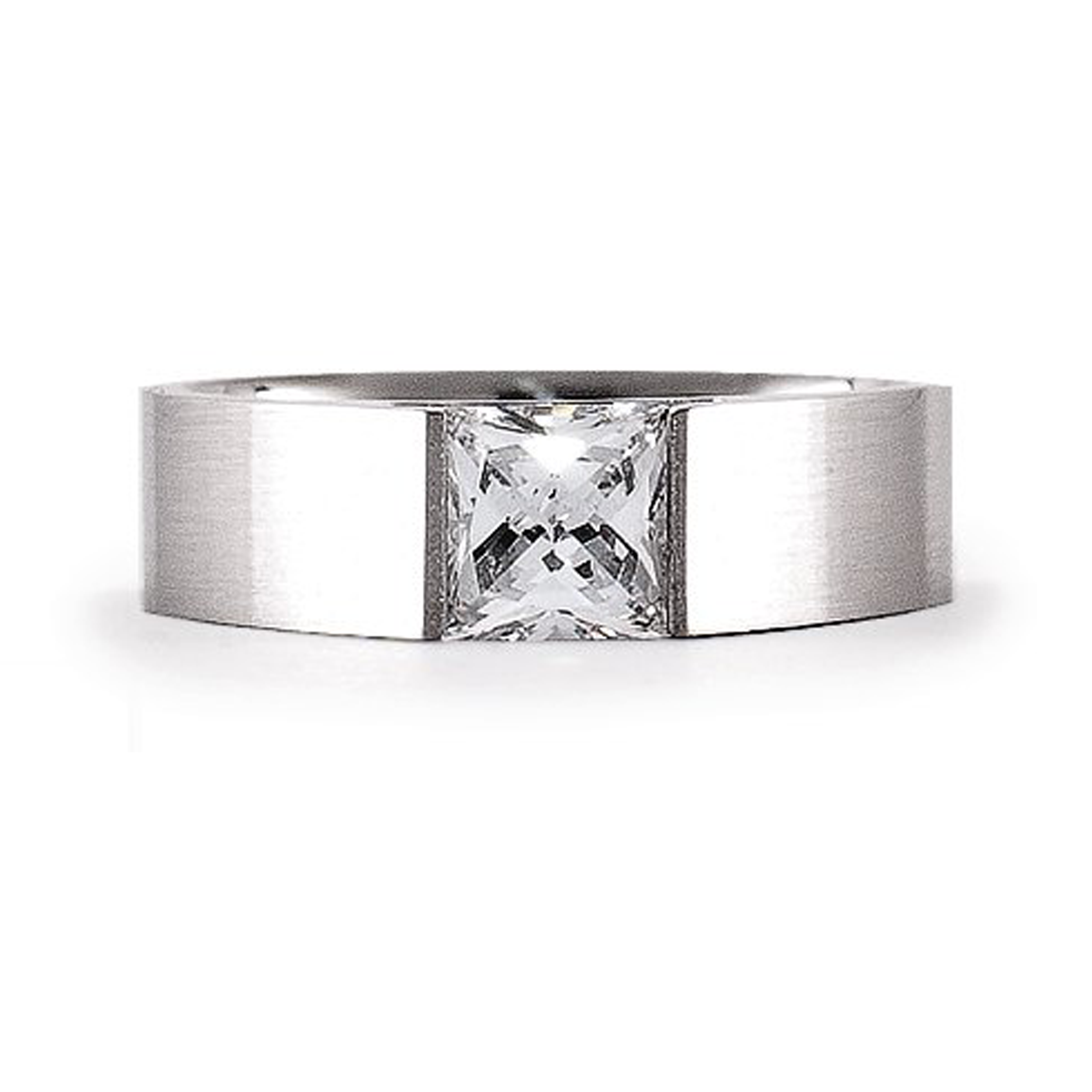The ring is fashioned from surgical-grade stainless steel that has a bright, sterling silver-like shine. The impressive 1 ct stone at the top is our unique B.Tiff Diamond Alternative stone. Each of our stones has been expertly cut to display the most fire and light reflection. Rating an 8.5 on the Mohs hardness scale and internally flawless, this is a stone you can be proud to wear.