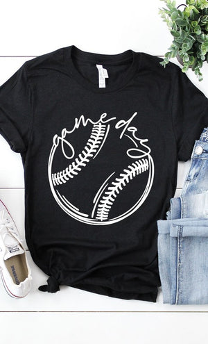 Its striking design features a smooth cursive "Game Day" script, elegantly paired with a unique white ink baseball graphic that pops. You can trust that this eye-catching print is made to last, thanks to high-quality inks that resist fading and peeling, regardless of how many games you attend.
