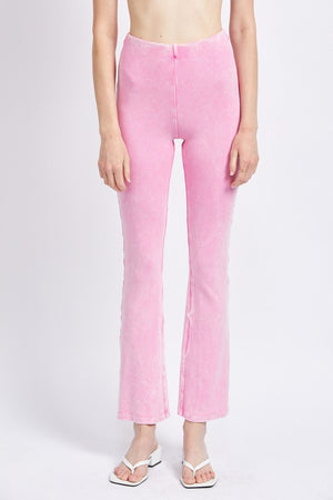 Close up view of the top half of HIGH WAIST RIB FLARED PANTS-pink