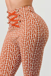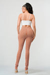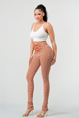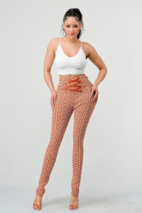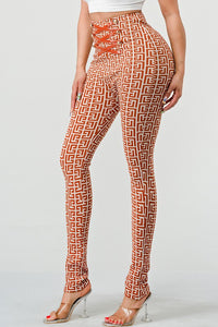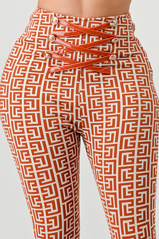 Featuring a stunning print design, these high waist bandage pants are more than just a wardrobe staple; they're a statement piece. Whether you're dressing them up for a night out or styling them casually for brunch with friends, they effortlessly adapt to any occasion. The crisscross string button front detail adds an edgy twist, ensuring you stand out wherever you go.