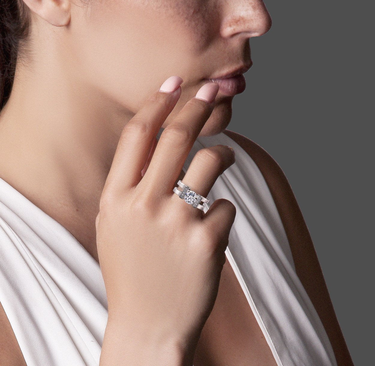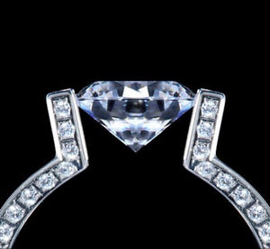 You want the perfect engagement ring, the one that will leave her speechless. This is it. Our B.Tiff 2 ct Moissanite Round Solitaire Interlocking Engagement Ring is literally paved in stones. No matter where you look, there is something to admire for its beauty and shine.