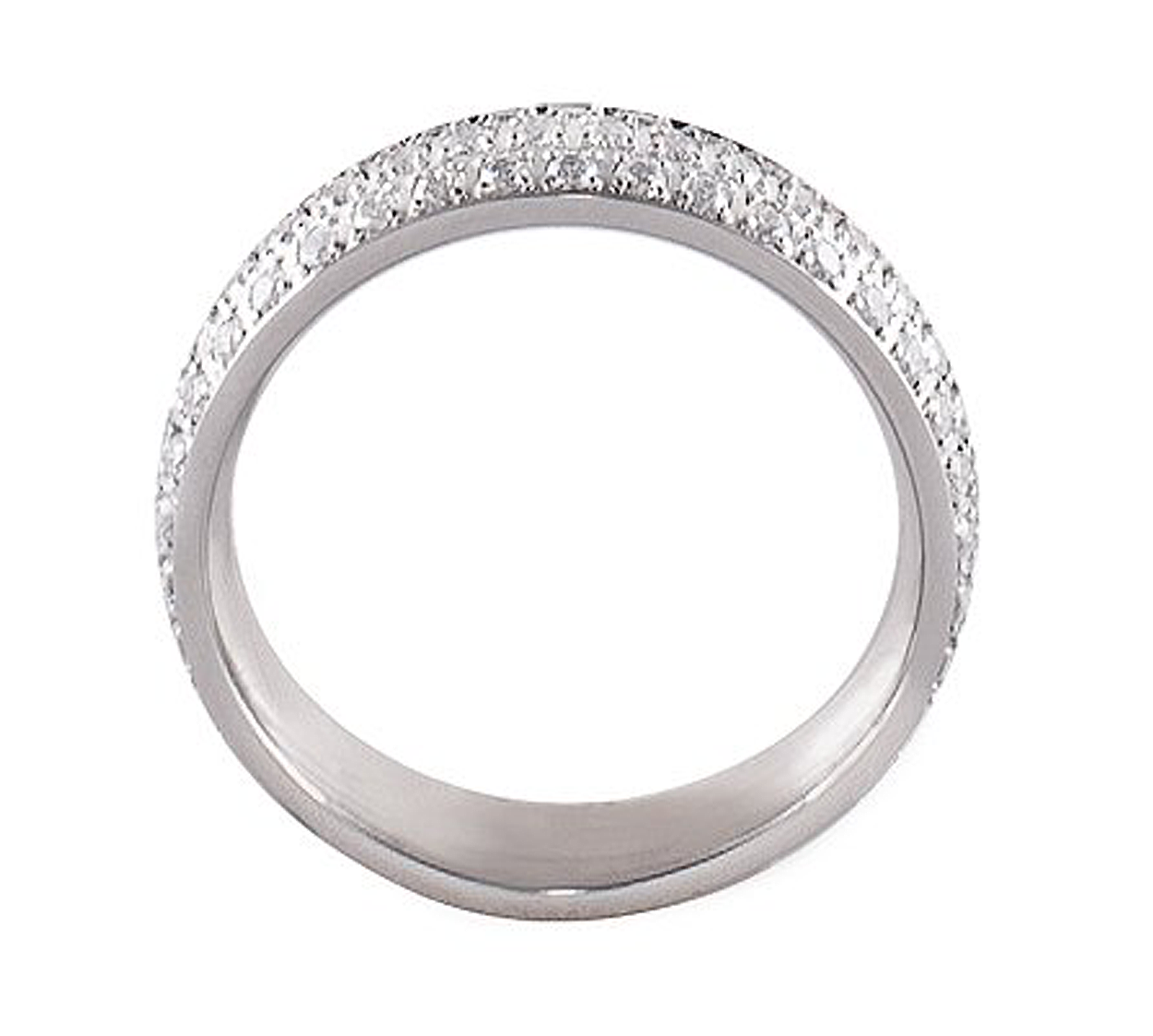 Covered head to toe in three rows of brilliant .01 ct B.Tiff Diamond Alternative stones, over 100 stones are here to dazzle you and whoever your lucky date is tonight. If you’re looking for some extra adoration, then this ring will do it. The stones are set in our hypoallergenic, surgical stainless steel. Choose between dazzling silver or always attractive gold.