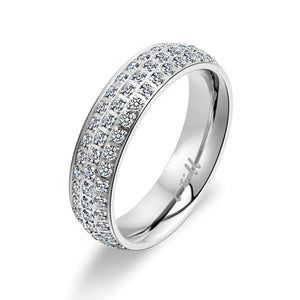 Covered head to toe in three rows of brilliant .01 ct B.Tiff Diamond Alternative stones, over 100 stones are here to dazzle you and whoever your lucky date is tonight. If you’re looking for some extra adoration, then this ring will do it. The stones are set in our hypoallergenic, surgical stainless steel. Choose between dazzling silver or always attractive gold.