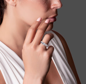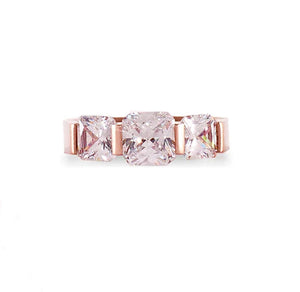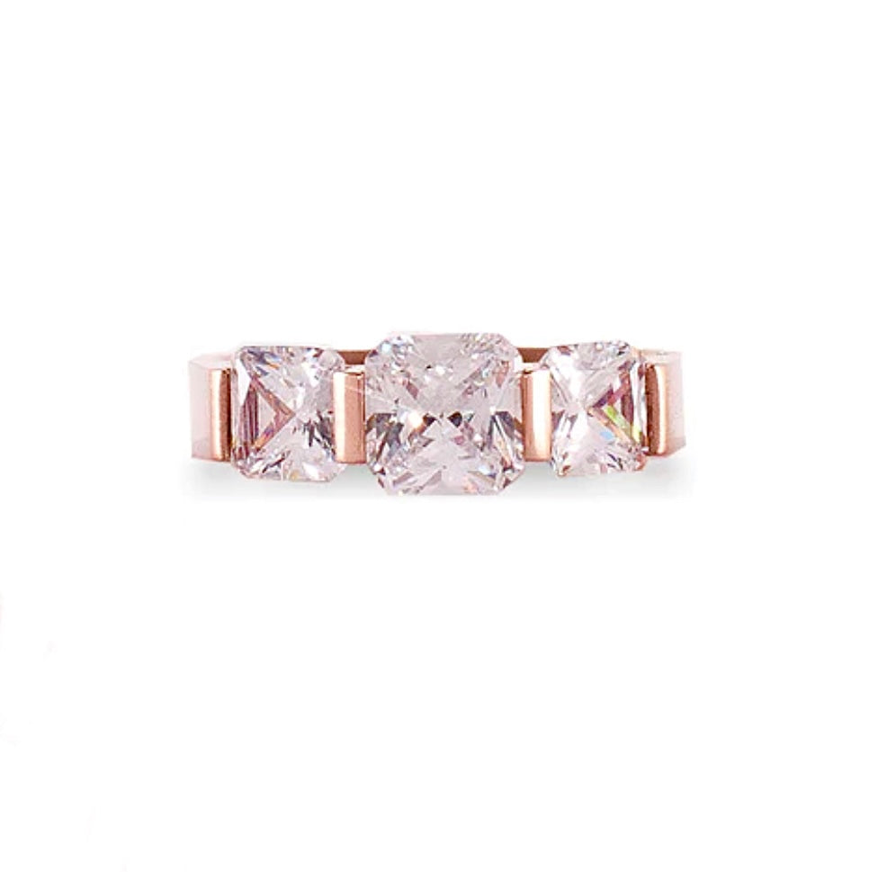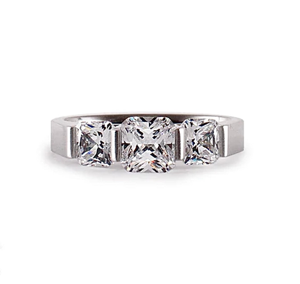 At the top, you'll find one large .75 ct and two .25 ct Cushion Cut B.Tiff Diamond Alternative stones. Arranged beautifully and cut to perfection, these stones give the piece a dramatic flair. All B.Tiff stones are internally flawless and never cloud or dim. As lovely as any precious metal, our ring is made from surgical stainless steel that is durable, allergy-free and shines brightly in the light.