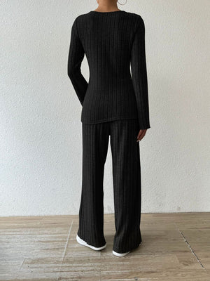 Ribbed V-Neck Long Sleeve Top and Pocketed Pants Set