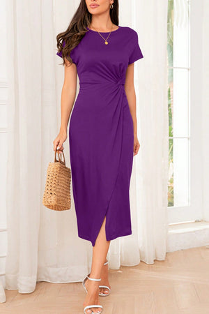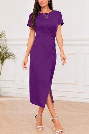 Step Into Elegance with the Slit Round Neck Short Sleeve Midi Dress