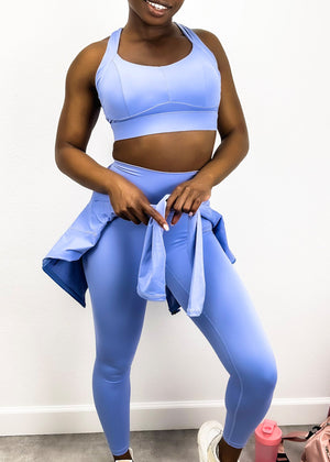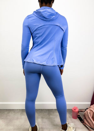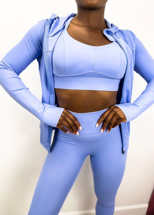 Blue Three-Piece Hooded Zip Jacket, Sports Bra, and High-Rise Leggings Set