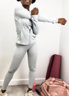 Gray Three-Piece Hooded Zip Jacket, Sports Bra, and High-Rise Leggings Set