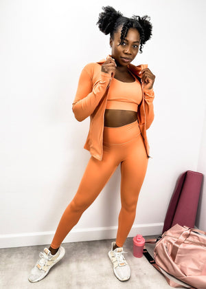 Orange Three-Piece Hooded Zip Jacket, Sports Bra, and High-Rise Leggings Set
